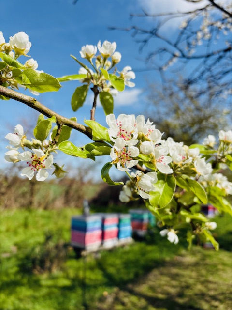 Die ersten milden Tage am Niederrhein kündigen den Frühling an. Für die Bienen ist das ein entscheidender Moment: Die Königin legt zunehmend Eier, die Pflegebienen versorgen die Brut, und die Völker beginnen, ihre Frühjahrsaktivität deutlich zu steigern. Gleichzeitig öffnen die ersten Obstbäume ihre Blüten, und die Kirsche, Pflaume und Birne liefern die ersten reichhaltigen Nektarquellen.