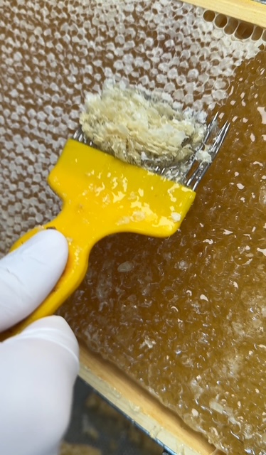 Nach der Ernte werden die Waben in unsere Honigküche nach Schneppenbaum gebracht. Zunächst erfolgt das Entdeckeln: Die dünne Wachsschicht, die die Bienen über dem reifen Honig angebracht haben, wird vorsichtig entfernt. Dies ist ein sensibler Arbeitsschritt, denn er gibt den Honig frei, ohne die wertvollen Enzyme, Aromastoffe oder Pollen zu zerstören.