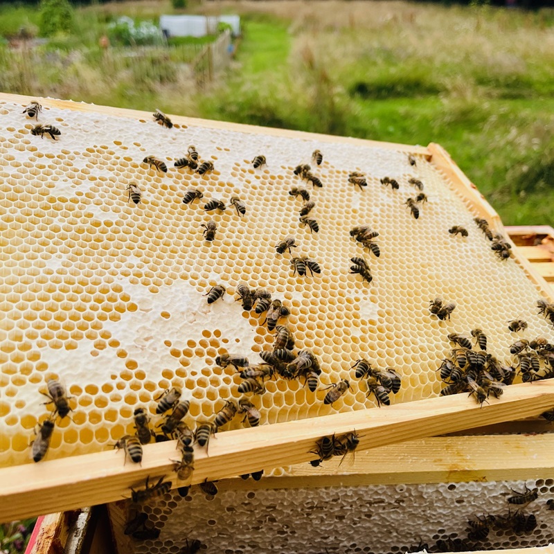 Beim Herausnehmen der Waben achten wir besonders darauf, die Bienen so wenig wie möglich zu stören. Jede Wabe wird vorsichtig aus den Honigräumen entnommen, während wir darauf achten, dass im Volk genügend Vorräte verbleiben. Nur so bleiben die Bienen gesund, aktiv und leistungsfähig. Schon beim ersten Heben der Waben hört man das lebendige Summen, die Sonne glitzert auf den goldenen Tropfen, und ein leichter Duft von Blütenhonig liegt in der Luft. Dieser Moment zeigt, wie eng Natur, Bio-Imkerei und Wertschätzung für die Bienen miteinander verbunden sind.